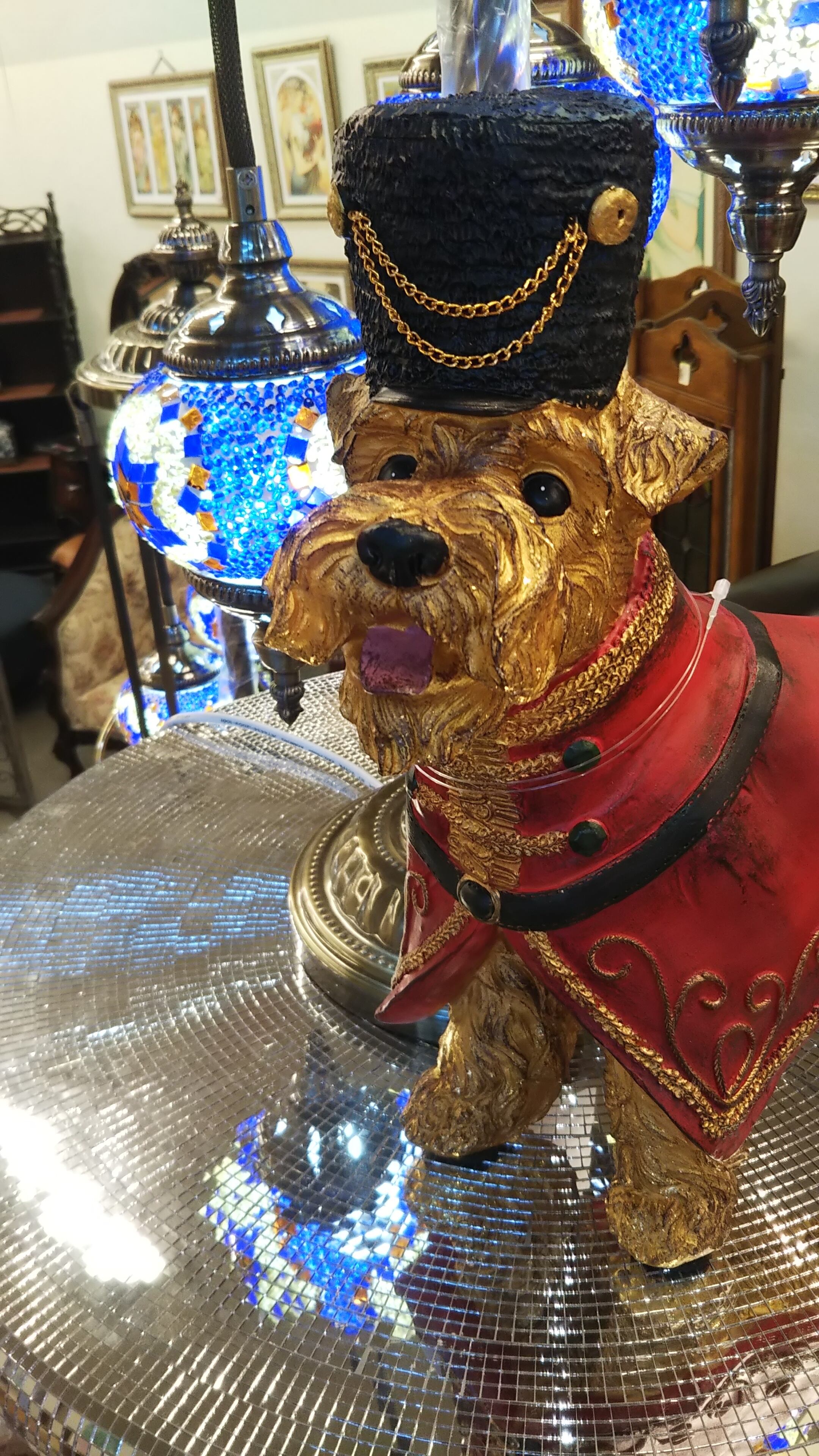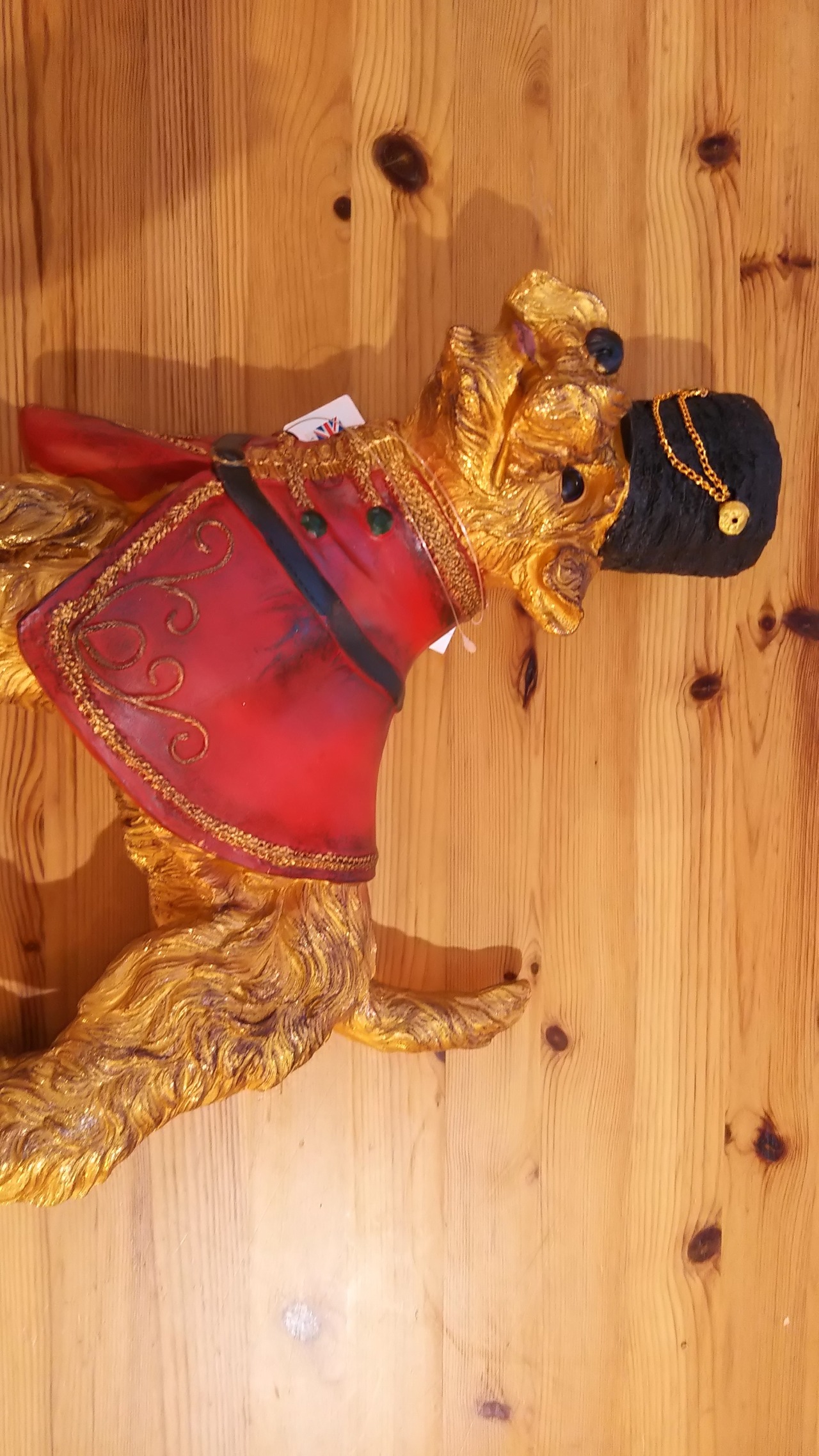 イギリスの衣装を着飾ったヨークシャテリアの置物。